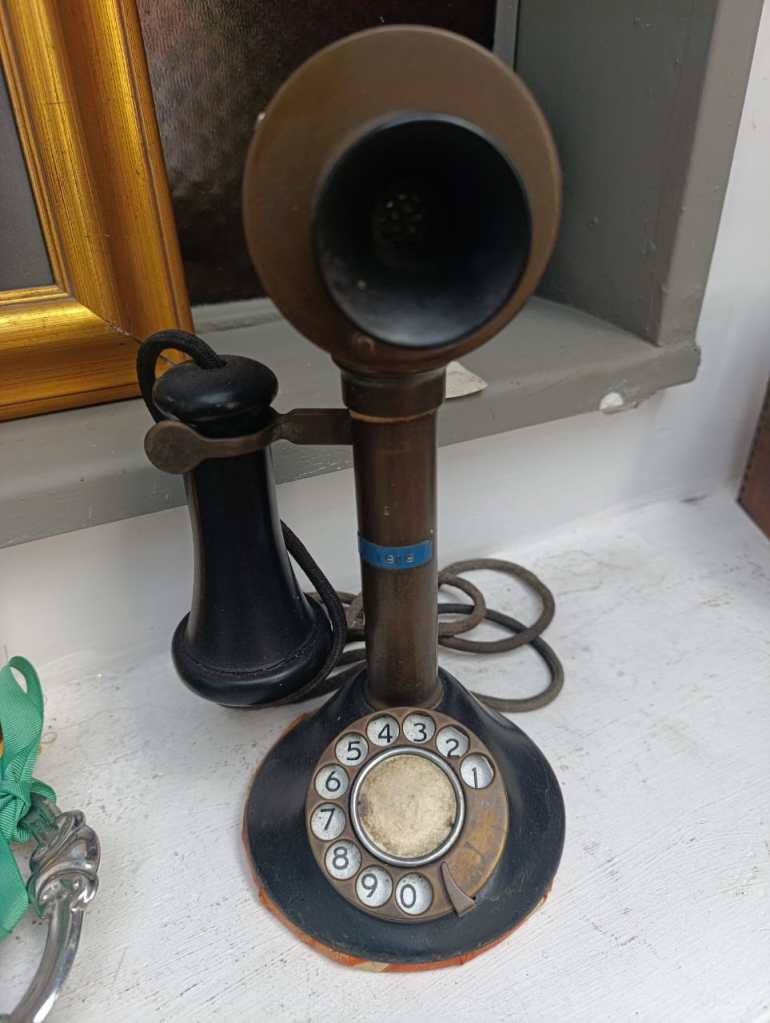 Este ejemplar pertenece a la familia de teléfonos candlestick o “de candelabro”, caracterizados por su diseño vertical y componentes separados: