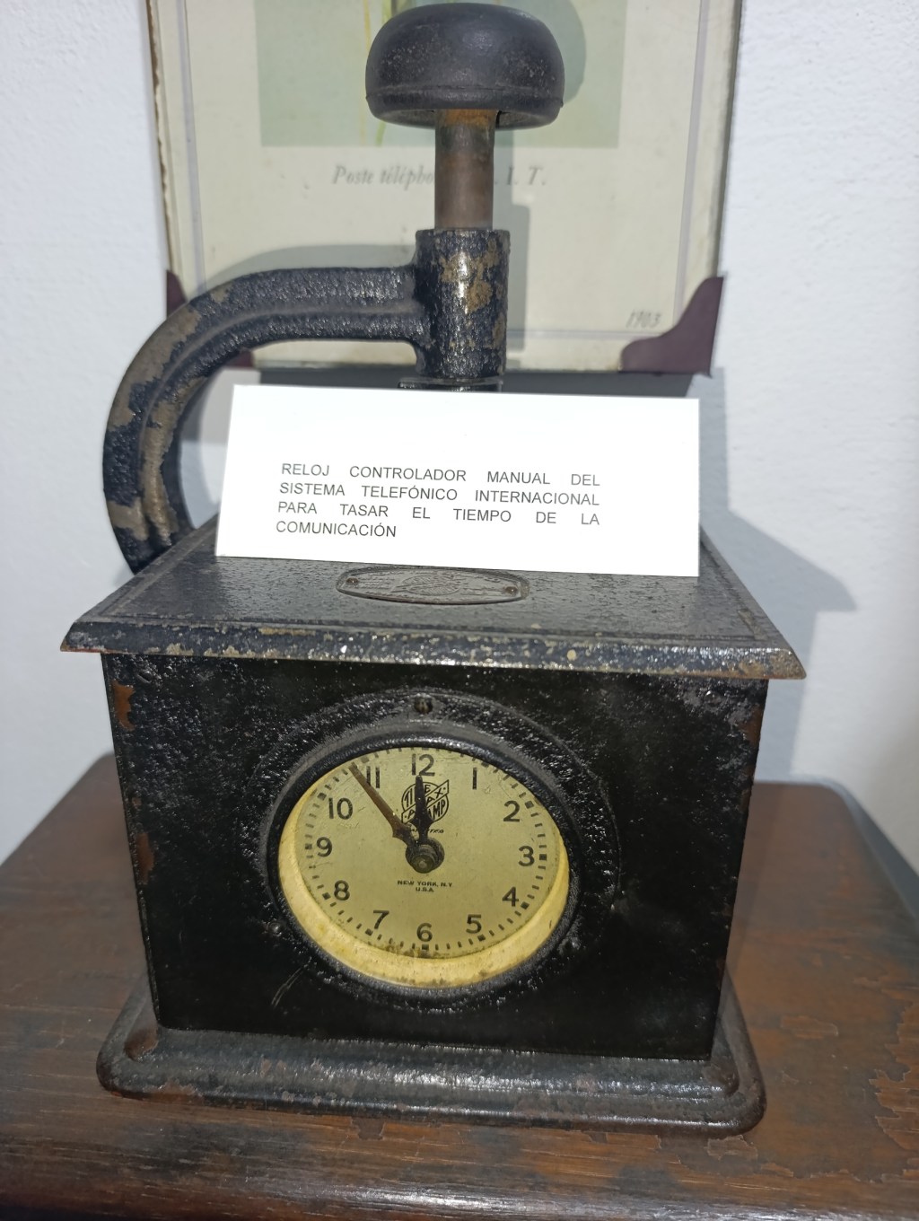 La pieza exhibe una robusta carcasa metálica en negro industrial, con una esfera horaria de 12 horas y una sola aguja, diseñada para marcar intervalos específicos bajo supervisión operativa. En la parte superior, un mecanismo de activación manual —probablemente un pulsador o palanca de reseteo— permitía iniciar o detener el conteo según el protocolo de conexión. La inscripción “NEW YORK, N.Y. USA” junto al emblema “DMP” certifica su origen norteamericano, mientras que la etiqueta explicativa en español sugiere su uso en estaciones de control latinoamericanas, posiblemente en oficinas de enlace o centrales de tráfico internacional.