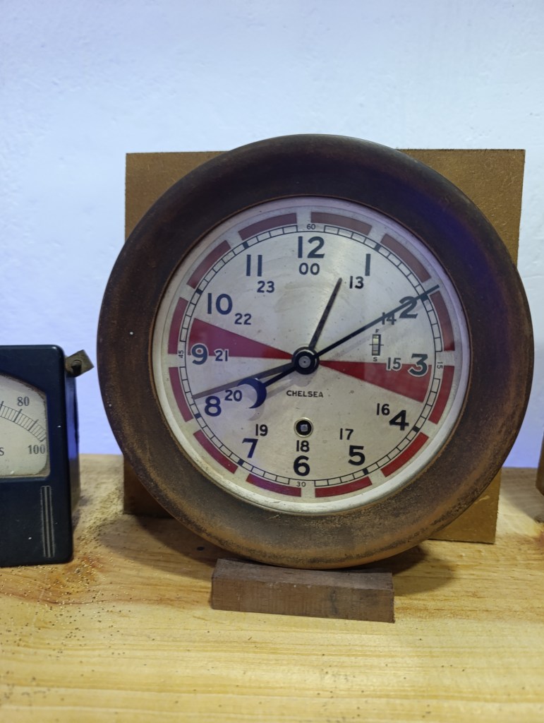 Esta pieza corresponde a un reloj de navegación de la prestigiosa firma estadounidense Chelsea Clock Company, reconocida por proveer instrumentos de precisión a embarcaciones militares y civiles desde 1897. Su diseño robusto y funcional, con caja metálica envejecida y montaje sobre base de madera, revela su uso en contextos marítimos exigentes, donde la fiabilidad horaria era esencial para la coordinación y el posicionamiento.