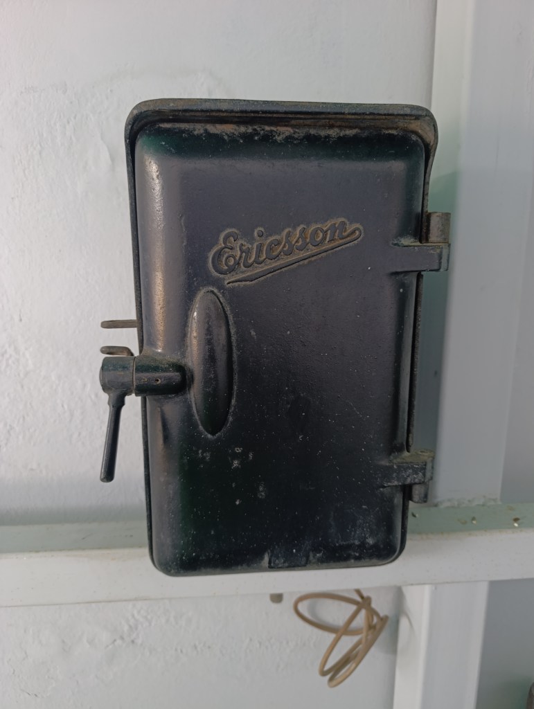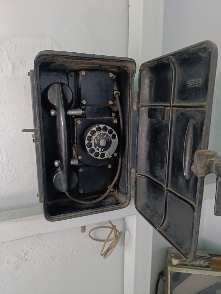 El dispositivo conserva su manivela lateral de llamada, mecanismo característico de los sistemas magneto-manuales previos a la automatización por disco. Su montaje mural y la presencia de cableado expuesto sugieren una instalación fija, posiblemente en estaciones técnicas o puntos de control operativo. La caja metálica, de cierre hermético, refuerza su función protectora frente a humedad, polvo y manipulación indebida.