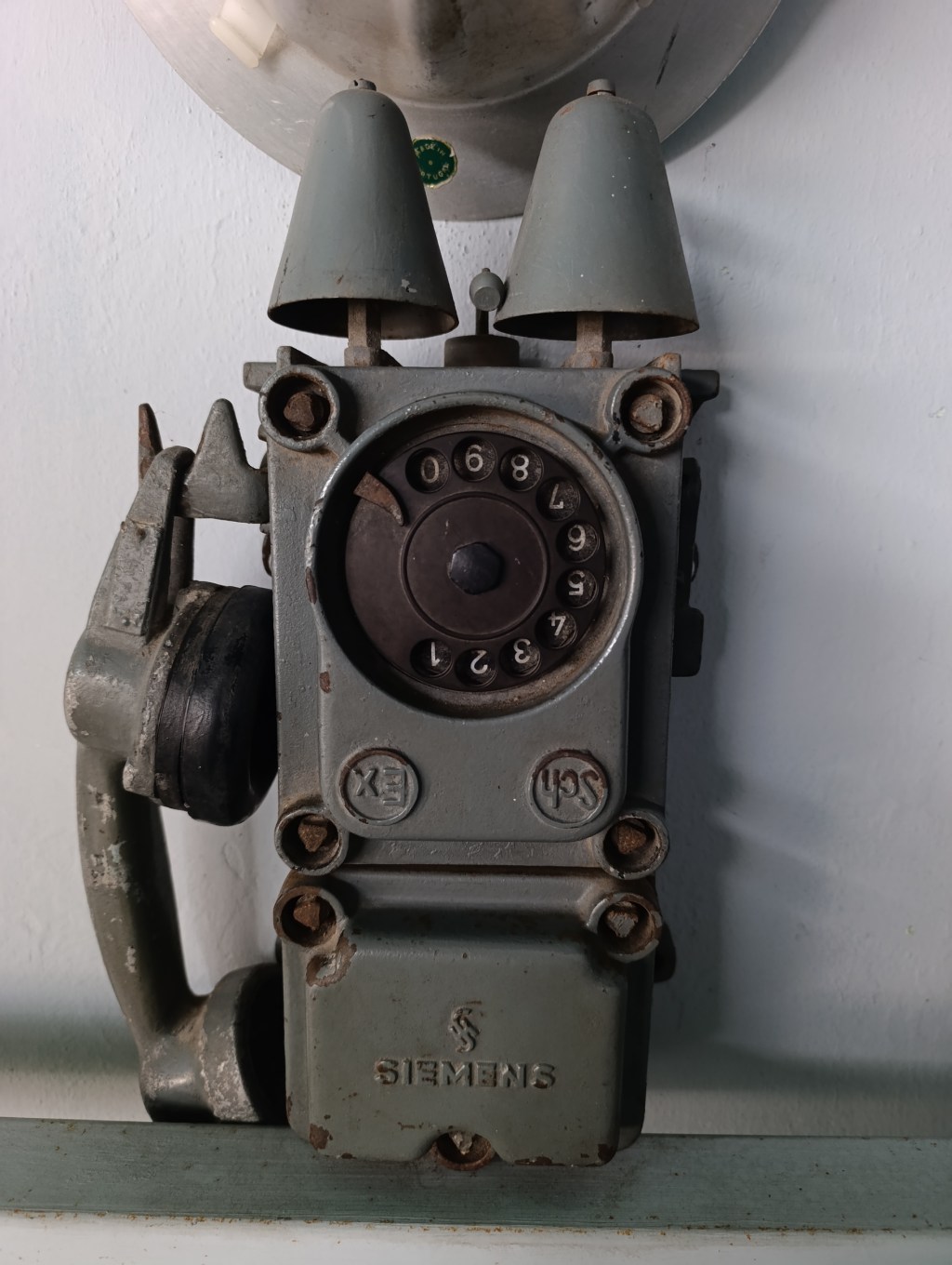 Este ejemplar corresponde a un teléfono mural de la firma SIEMENS, diseñado para entornos industriales de alta exigencia. Su estructura metálica, de acabado sobrio y funcional, revela una vocación operativa orientada al control técnico y la comunicación interna en obras de gran escala.